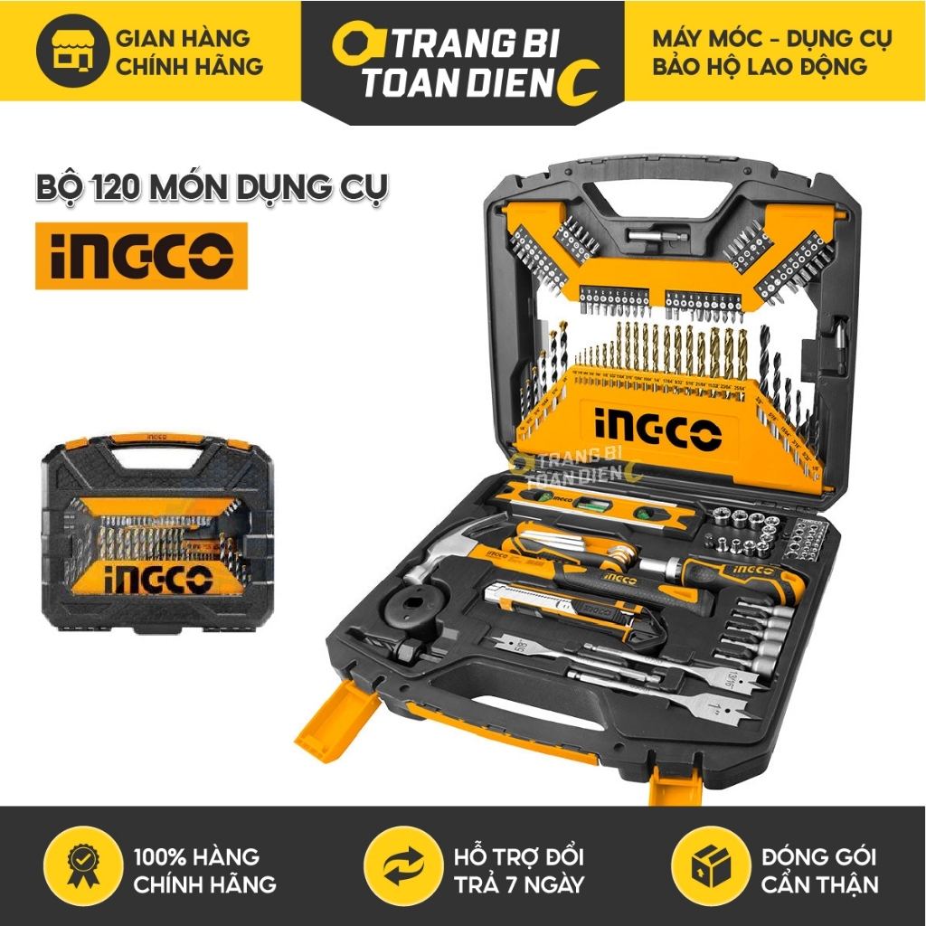 Bộ đồ nghề 120 dụng cụ INGCO HKTAC011201 gồm Mũi Khoan, Thước Thủy, Dao Rọc Giấy, Đầu tuýp, Cờ Lê, Búa - Chính hãng
