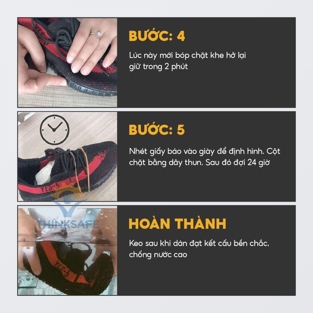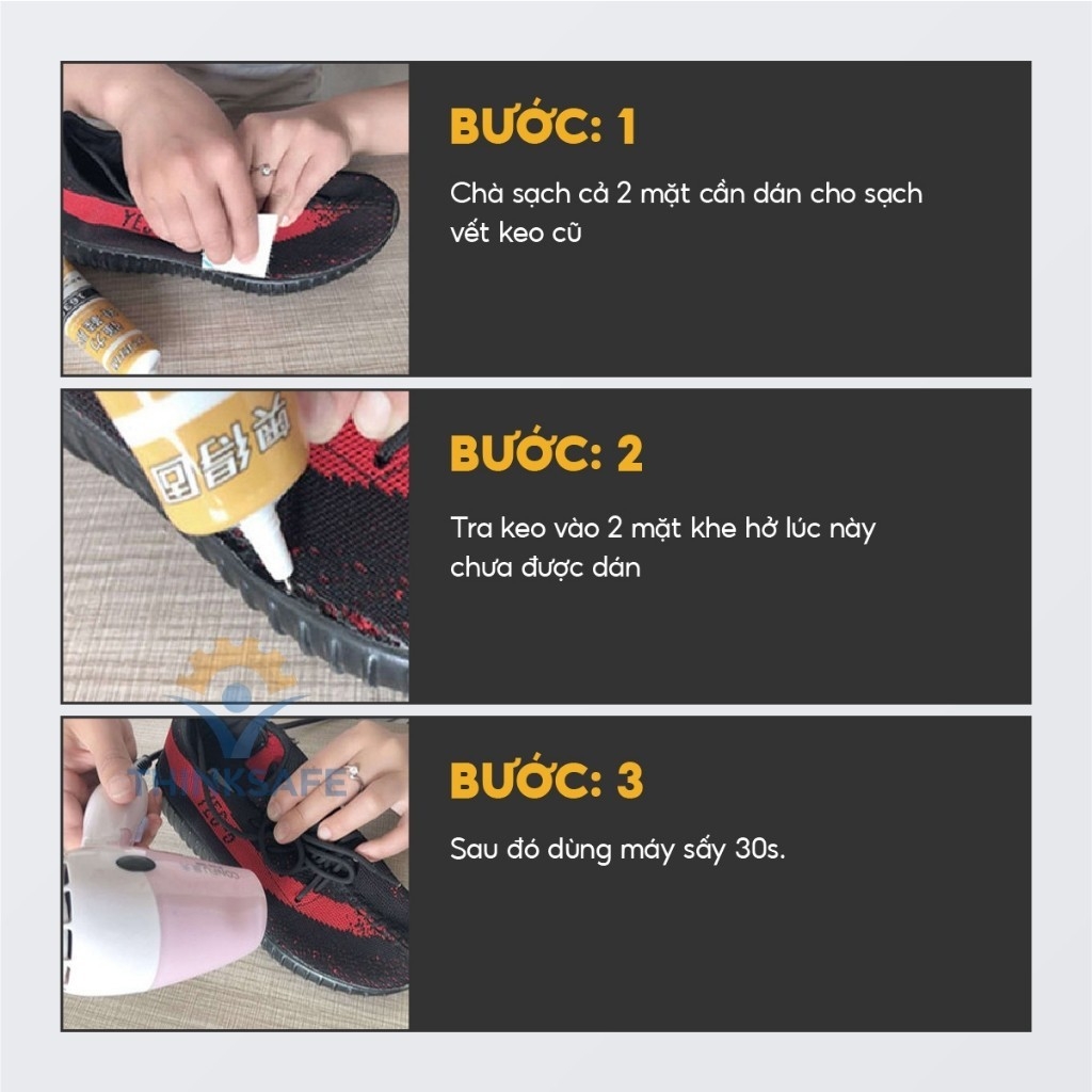 Keo dán giày AODEGU dùng nhiệt siêu dính dùng để dán giày thể thao, giày đá bóng, sneaker, dép,... THÔNG SỐ KỸ THUẬT - Mã sản phẩm: DCTS012 - Dung tích: 60ml - Sản phẩm bao gồm: 1 Lọ keo dán và giấy nhám, vòng nịt dùng để buộc chặt vết rách sau khi dán keo - Thích hợp sử dụng: Giày dép, túi xách, đồ nội thất bằng da, quần áo da,... ĐẶC ĐIỂM NỔI BẬT - Chất keo trong suốt, lành tính, an toàn, không gây hại cho da tay - Không tạo nhiệt làm biến dạng bề mặt dán - Không tạo cặn trắng, ố vàng sau khi dán - Chống nước tốt, đi mưa không bị bong keo - Phù hợp dán mọi loại giày dép, giày da, cao gót..... HƯỚNG DẪN SỬ DỤNG - Bước 1: Chà sạch cả 2 mặt cần dán cho sạch vết keo cũ - Bước 2: Tra keo vào hai mặt khe hở. Lúc này chưa được dán - Bước 3: Dùng máy sấy, sấy vào vết keo tầm 30 giây - Bước 4: Sau khi sấy xong, bóp chặt khe hở lại và giữ trong 2 phút - Bước 5: Nhét giấy báo vào giày để định hình. Cột chặt bằng dây thun. - Bước 6: Lau khô keo thừa. Đợi từ 24 đến 48 tiếng LƯU Ý KHI SỬ DỤNG - Bảo quản nơi khô ráo, thoáng mát, tránh xa tầm tay trẻ em. - Tránh để keo tiếp xúc với mắt, miệng. - Đóng nắp sau khi sử dụng để bảo quản keo LỰA CHỌN SẢN PHẨM TẠI TRANG BỊ TOÀN DIỆN - Giá luôn tốt - Sản phẩm đảm bảo chính hãng, đổi trả dễ dàng - Nhà phân phối chính hãng uy tín từ các thương hiệu lớn: 3M, Ansell, Honeywell, Safety Jogger… #keodangiay #dan #keodan #keodandep #keodango #keodansieudinh #keodangiayda #keodandegiay #keodanchongtham #dangiay #aodegu